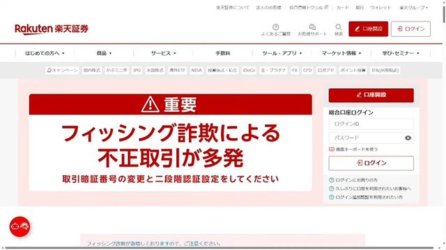 楽天証券はフィッシング詐欺に対して注意喚起を継続しており、公式サイトには以下のような警告が掲載されている。