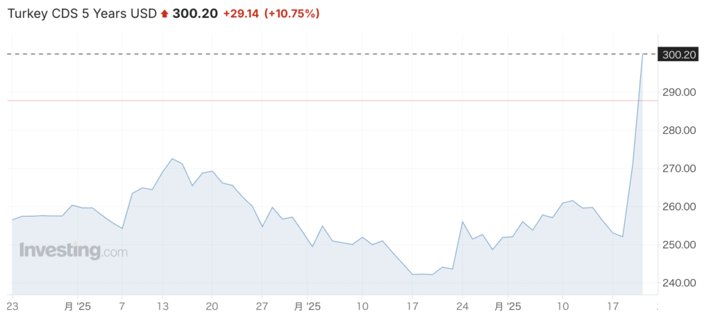 さらに、トルコのクレジット・デフォルト・スワップ(CDS=国債の信用リスクを表す指標)も急上昇し、322ベーシスポイントに達した。これは、2024年3月以来の最高水準であり、市場がデフォルト(債務不履行)の可能性を再び警戒し始めていることを意味する。