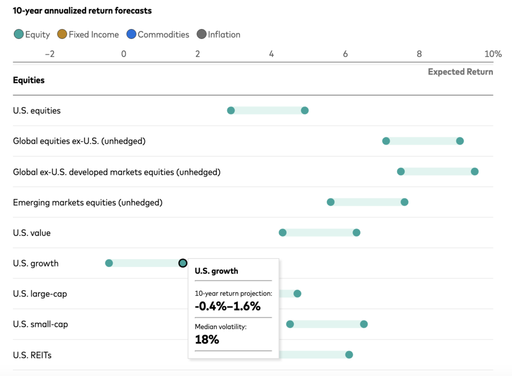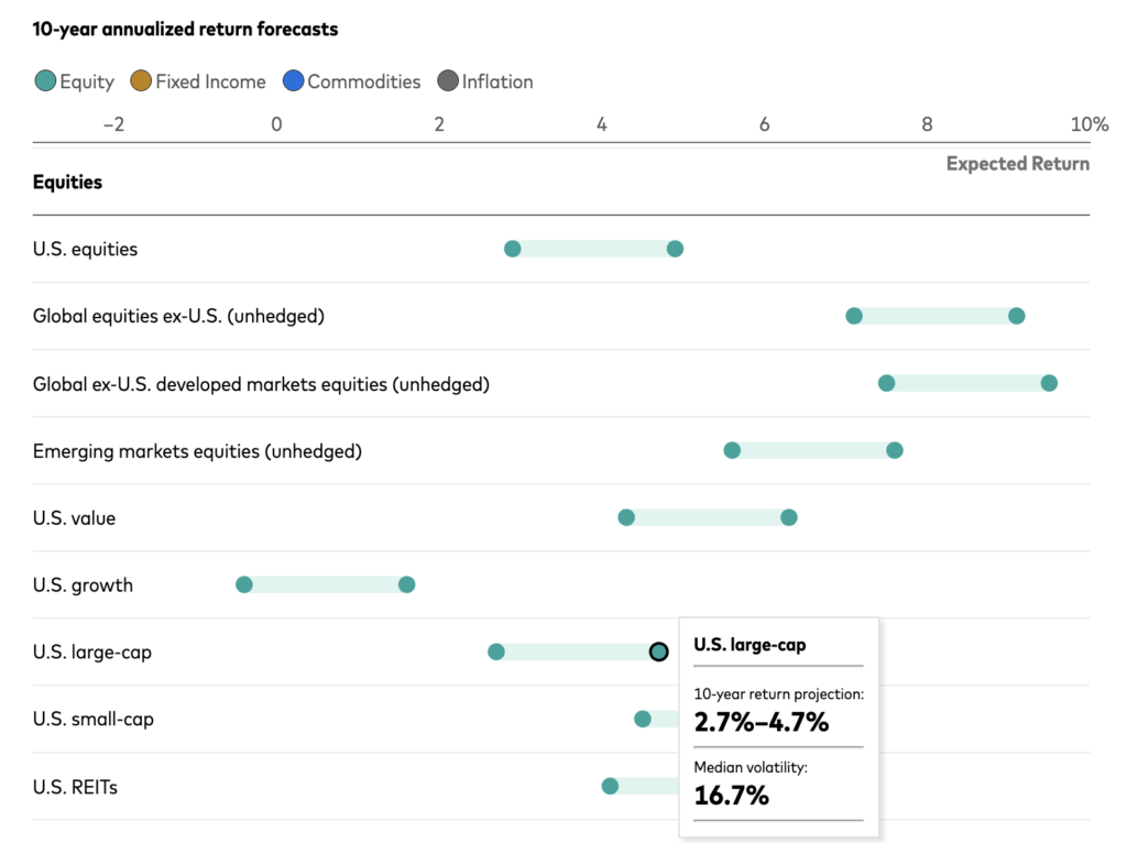 米国大型株の10年間の年率リターン予測は2.7%〜4.7%となっております。