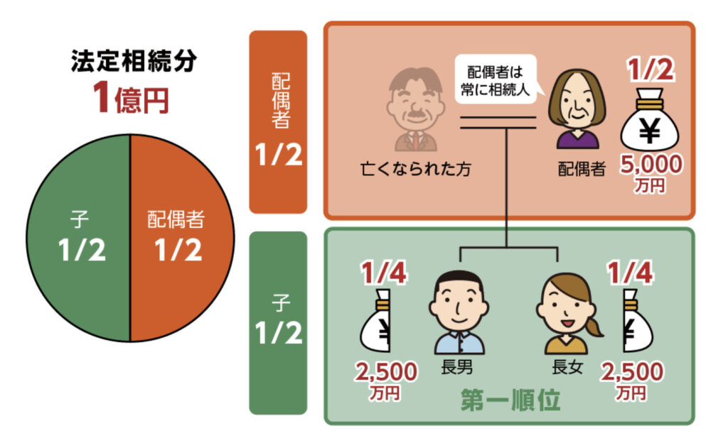 • 妻の法定相続分は「2億円 × 1/2 = 1億円」