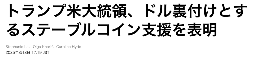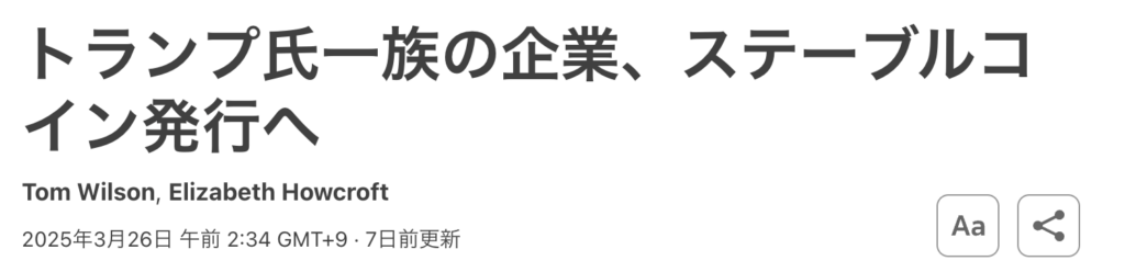 ちなみに、トランプ米大統領一族が経営に関わる「ワールド・リバティー・ファイナンシャル」は、米国債や米ドルなどの資産を裏付けとして、米ドルとの価値連動を目指すステーブルコイン「USD1」を発行することを3月26日に明らかにしております。