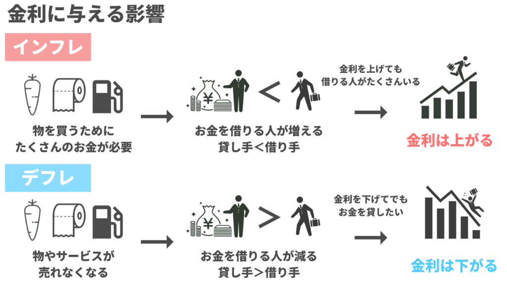 インフレとは、物価全体が持続的に上昇する現象であり、通貨の購買力が下がることを意味する。インフレが高まると、人々は将来の「実質的な価値の目減り」を避けるため、より高い金利を要求する傾向がある。