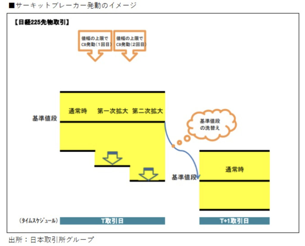 • 発動条件:先物取引の中心限月取引において、制限値幅の上限または下限に到達した場合に発動されます。
