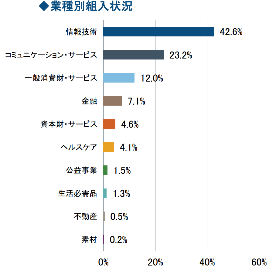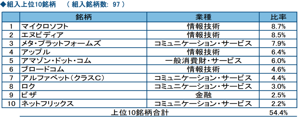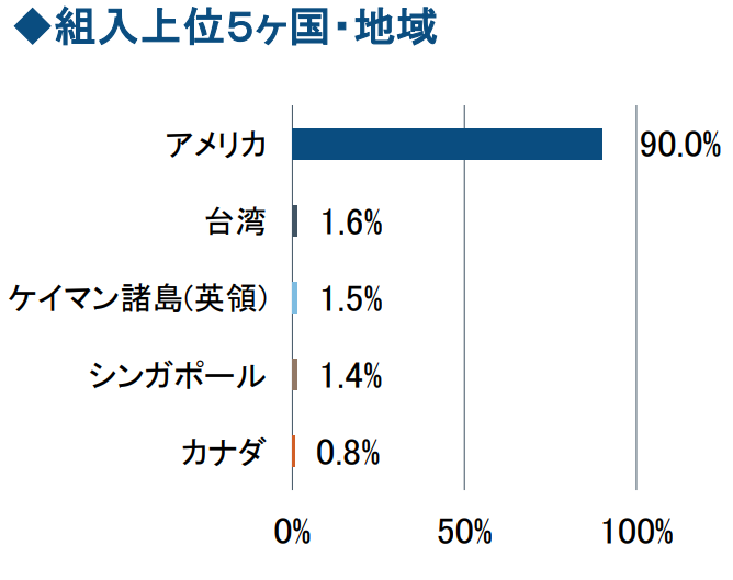 組入上位はFANG+銘柄が多く、90%が米国株になっていてほぼ米国株ファンドですね。