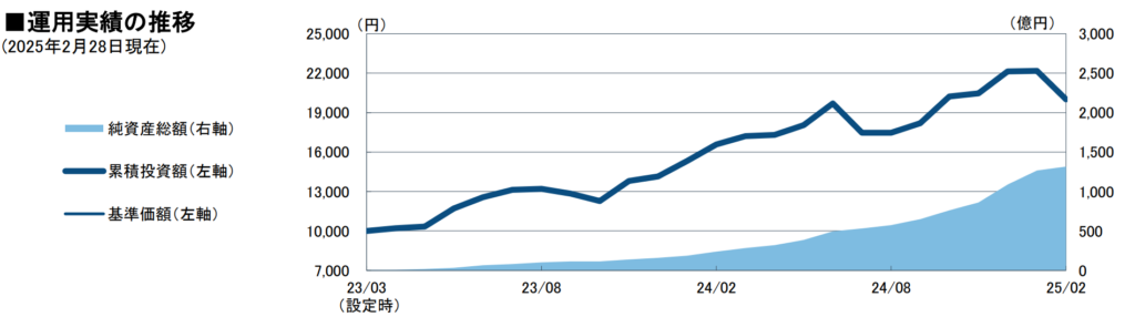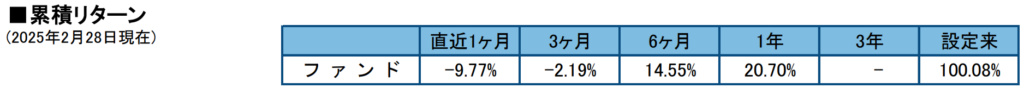 こちらのファンドは為替ヘッジあり/なし、分配金あり/なしで4つのファンドがありますが、今回はBコース(為替ヘッジなし、分配金なし)の数値で解説します。直近1年で+20.70%、設定来で+100.08%の騰落率になります。ファンド設定は23年3月なので2年程度の実績になります。