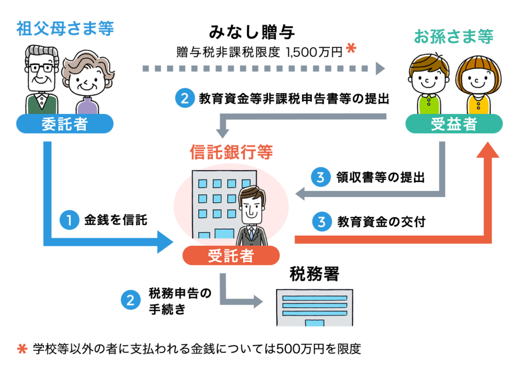 • 信託金額:一人あたり最大1,500万円まで非課税(学校外費用は最大500万円)