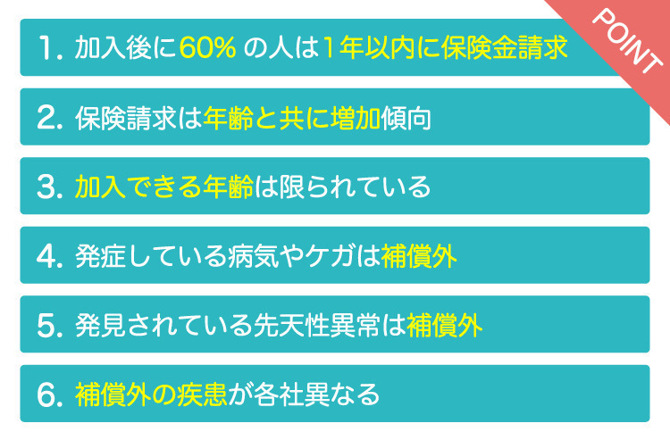 • 既往症や持病の取り扱い:加入前の病歴が不利になることも多い