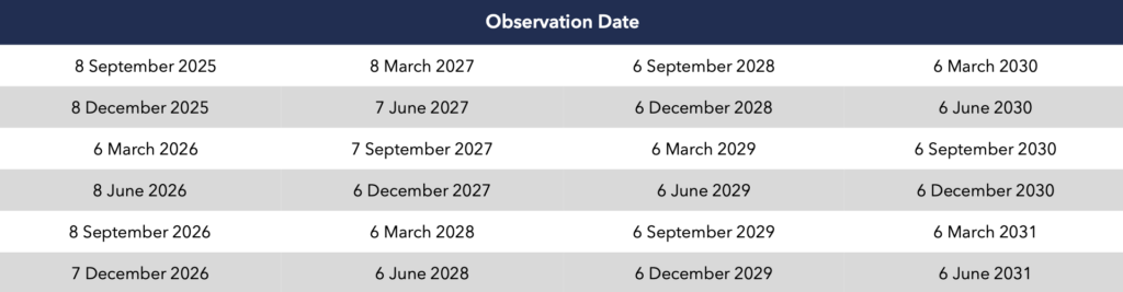 この商品では、満期時のリターンを計算する際、構成銘柄の最終株価だけを見るのではなく、6年間にわたって四半期ごとに観測されたパフォーマンスの平均値を用いる「平均化方式」が採用されています。