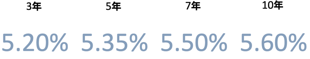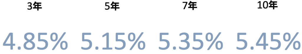『新海外固定金利商品』も5月1日時点における金利は10年プランで5.45%でしたが、7月に入れば、この金利も下がってくることが想定されます。実際に1年前の2024年5月時点では下記の固定金利で契約出来ていました。