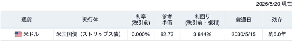 また『新海外固定金利商品』は預入期間が4種類(3年、5年、7年、10年)あるので、「ゼロクーポン債(ストリップス債)」も同じ残存期間に近いもので比較します。