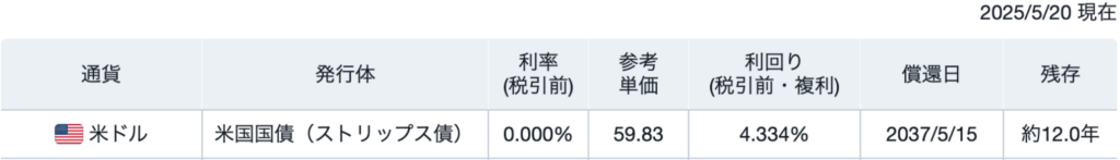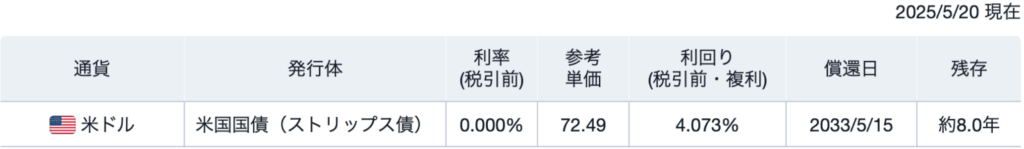 「利率(税引前・年率)」の項目を見ていただくと、米国国債にはそれぞれの%が掲載されており、米国国債(ストリップス債)は表示されていません(0%)。これが1年間に受け取れる利子(クーポン)の%を示しています。