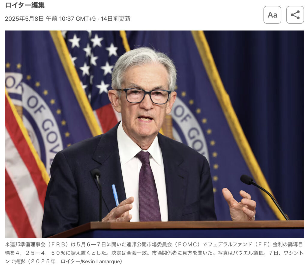 [2025年5月8日 ロイター] – 米連邦準備理事会(FRB)は6─7日に開いた連邦公開市場委員会(FOMC)でフェデラルファンド(FF)金利の誘導目標を4.25─4.50%に据え置くとした。決定は全会一致。