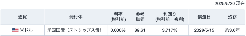 SBI証券に残存が3年、5年、8年、12年ものがありましたので、こちらを利用します。ちなみに、基本的に債券は残存が長い方が利回りは高くなりますので、米国国債(ストリップス債)の方が8年と12年については有利な条件となっています。