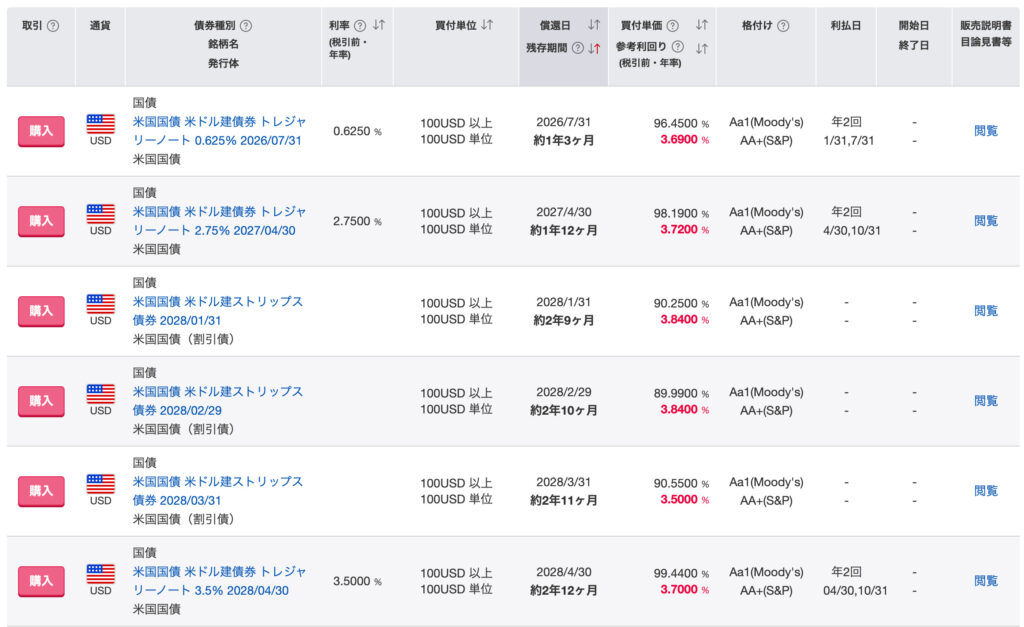 日本国内だと証券会社などの金融機関やネット証券だとSBIや楽天などから購入できます。「米国国債」と検索すると色々な種類の米国国債が販売されております。下記は楽天証券で購入できる米国国債の一部です。