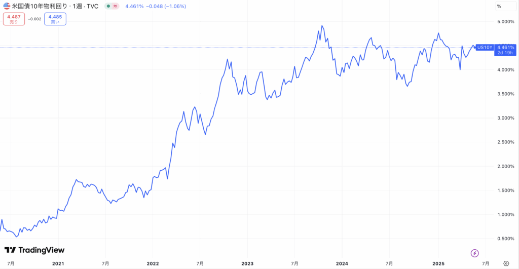 現在の米国10年債利回りは約4.461%と高止まりしており、インフレ圧力の継続やFRBの利下げ慎重姿勢、そして米国の財政不安(財政赤字の拡大と国債増発)が背景にあります。