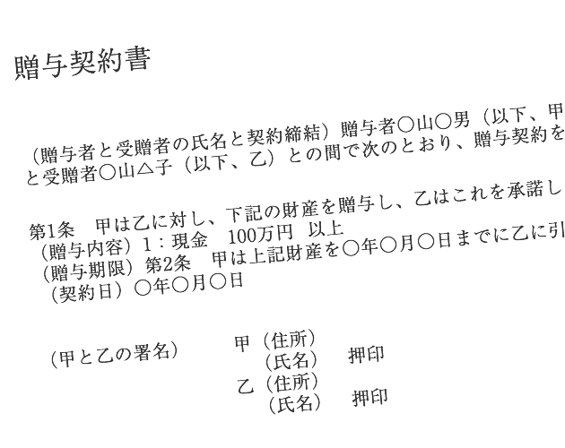 例えば「金銭100万円を無償で贈与する」と明記。対象財産が金銭以外(株式、不動産等)の場合も、詳細に記載。