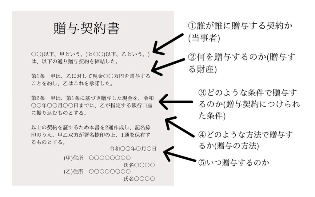 贈与契約書は法律文書であり、形式と内容の整合性が重要です。記載すべき主な要素は以下のとおりです。