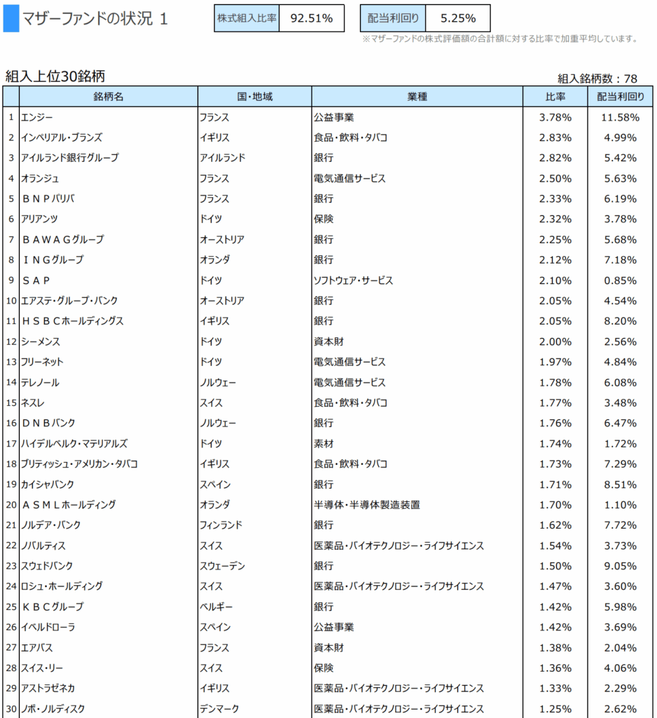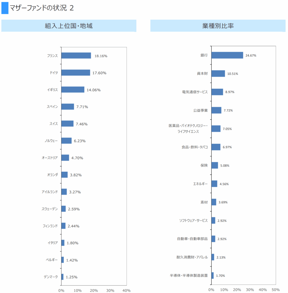 欧州でも経済規模が大きな、フランス、ドイツ、イギリスの組み入れ比率が大きく、業種別では銀行が突出していますね。投資先はしっかり配当を出せる欧州大型株が多いようです。