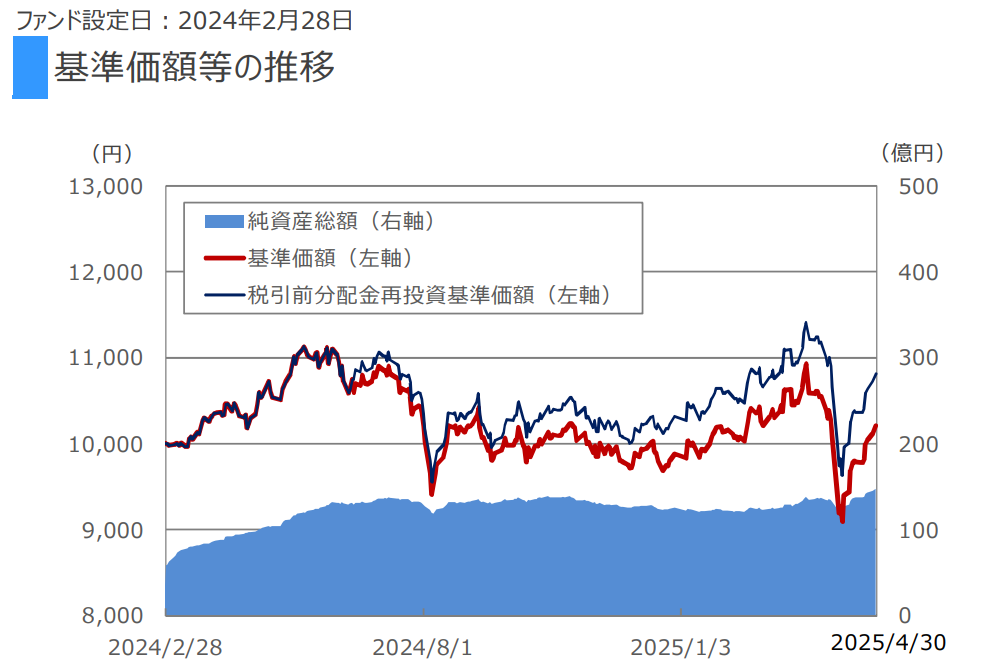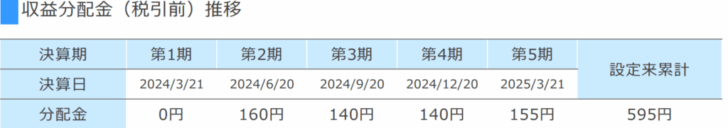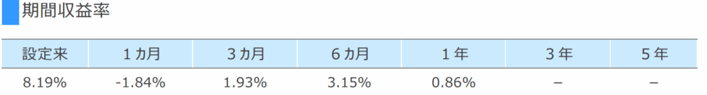 設定時から1年3か月程度での実績になりますが、直近1年で+0.86%、設定来で+8.19%の騰落率になります。年4回決算があり、分配金実績は上記の通りです。