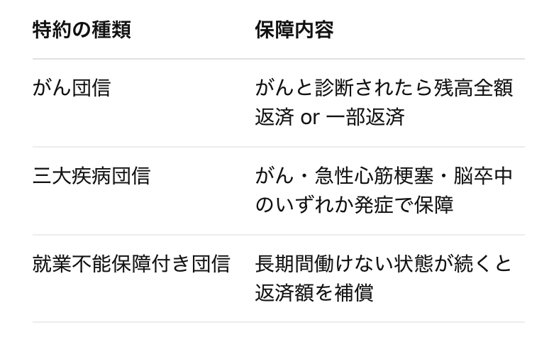 近年は、がん保障付き団信や三大疾病付き団信が主流化しつつあり、特にネット銀行などでは金利上乗せ(例:+0.1%)でオプションとして選択可能になっています。
