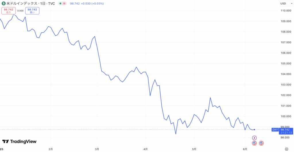 たとえば、5月初旬には米国株式ファンドから162億ドル超が流出し、米国債市場でも45億ドル規模の資金が抜けました。米ドル指数(DXY)は年初来で10%ほど下落しており、ドルの信頼感に揺らぎが出てきています。