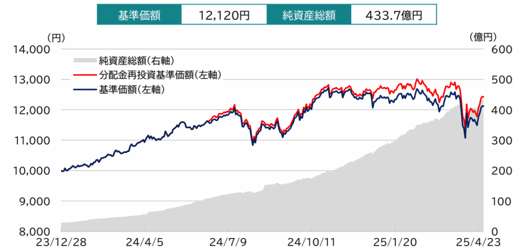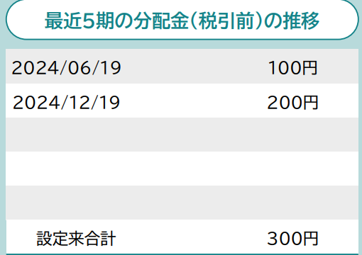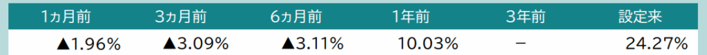 設定時から1年5か月程度での実績になりますが、直近1年で+10.03%、設定来で+24.27%の騰落率になります。分配金実績は添付の通りです。