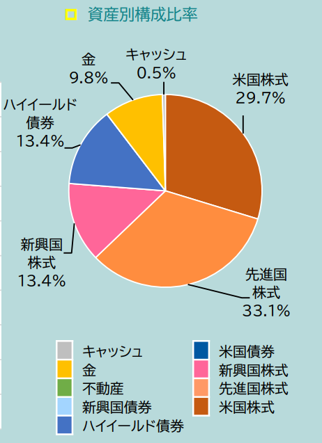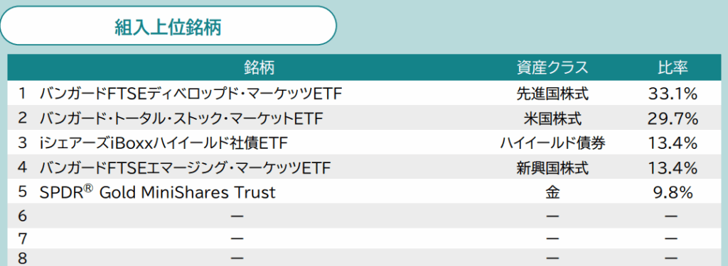 世界のETFに分散投資している関係上、投資先は個別銘柄ではなくETFになっています。先ほども触れた通り、月1回資産配分比率の見直しが入るので現在と投資比率は違う可能性が高いですが参考にしてください。