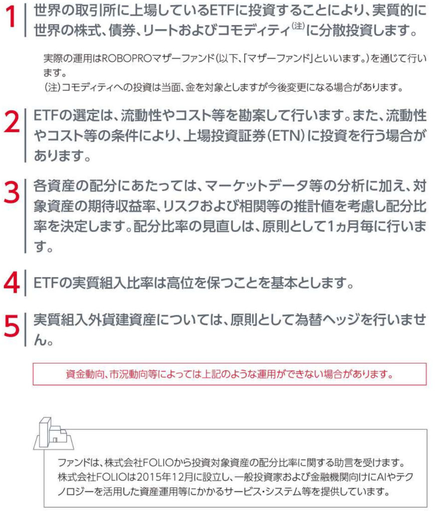 投資対象の配分比率にAIを活用して、世界の株式、債券、リートコモディディに分散投資します。SBIのグループ企業であるFOLIOがこの助言を行います。