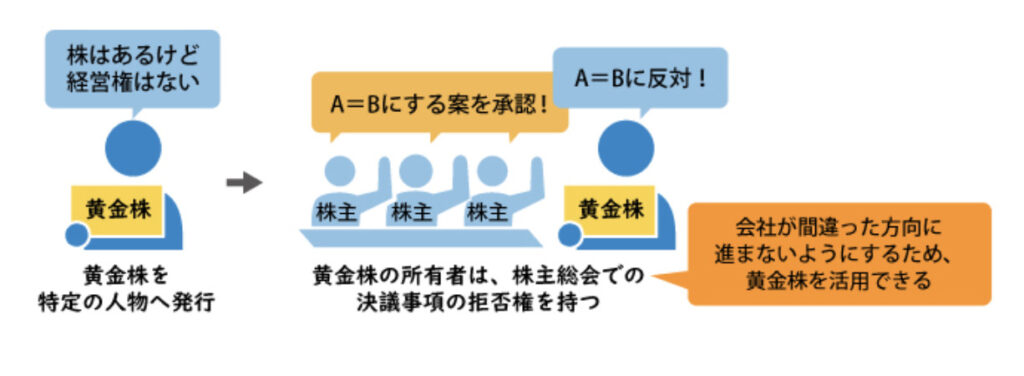 • 黄金株:たった1株でも、「定款変更」や「合併」「買収」などの重大事項に対して否決権を行使可能。