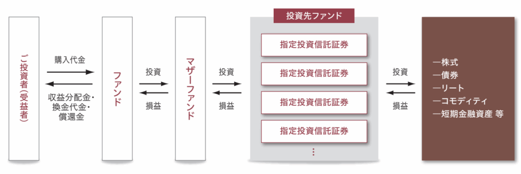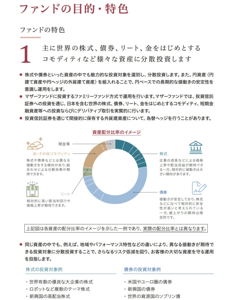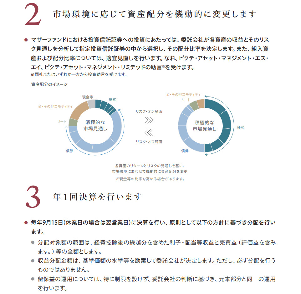 各資産の収益、リスク見通しを分析して指定されている投資信託証券の中から投資先を選択し、その配分比率を決定します。またピクテグループ内の会社から投資助言を受け、世界の株式、債券、リート、コモディディ等に分散投資します。