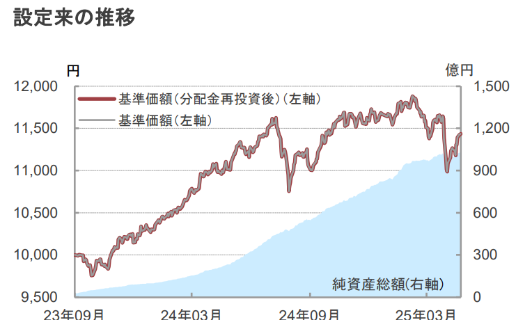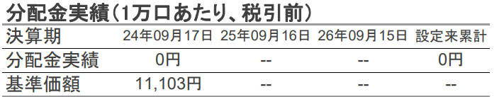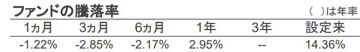 設定時から1年8か月程度での実績になりますが、直近1年で+2.95%、設定来で+14.36%の騰落率になります。また昨年度第1回目の分配金は0でした。