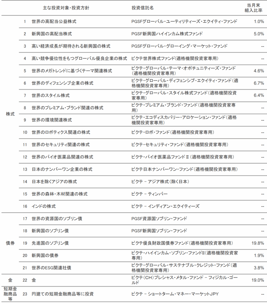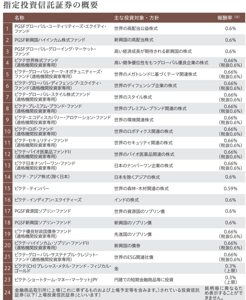 そうですね、指定されている投資信託証券は、ほぼピクテが組成しているファンドになります。