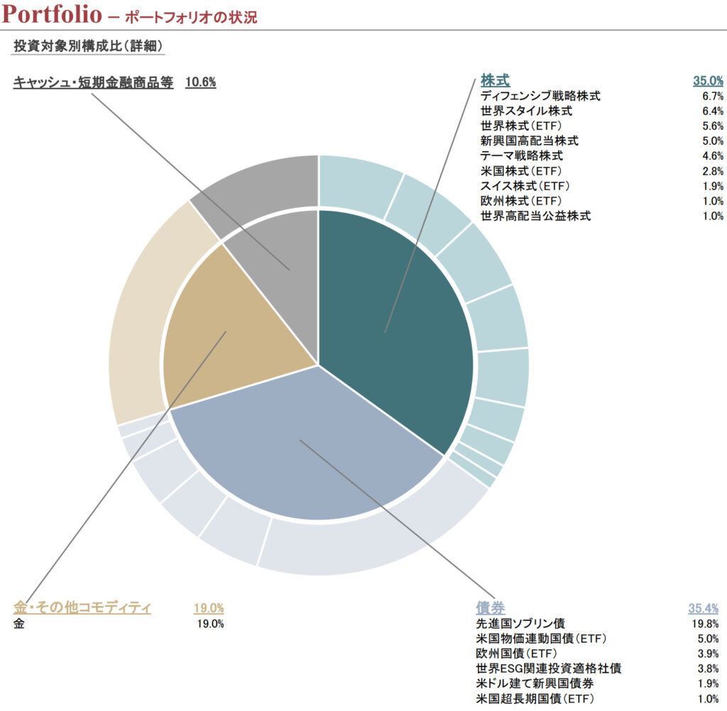 世界の投資信託証券に分散投資している関係上、投資先は個別銘柄ではなくピクテのファンドになっています。組入比率の表からは全体が読み取りづらいのでポートフォリオから全体像と投資先を確認いただくのが分かりやすいと思います。現在は債券、金に合計50%以上を投資しているので、保守的なポートフォリオになっています。