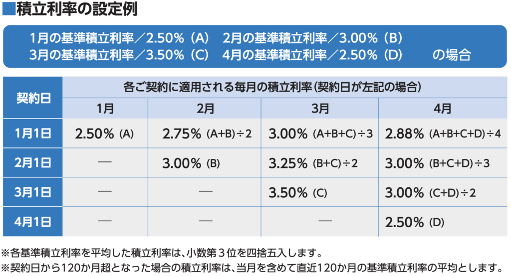 まず通貨の指標金利からマニュライフが「-1.0%〜+1.5%」増減させた数字が基準積立利率になります。さらに基準積立利率を契約日から毎月平均(最大で直近120ヶ月)したものが積立金に適用される積立利率になります。ちなみに現在(2022年2月)の基準積立利率は2.55%(米ドル)と2.30%(豪ドル)です。