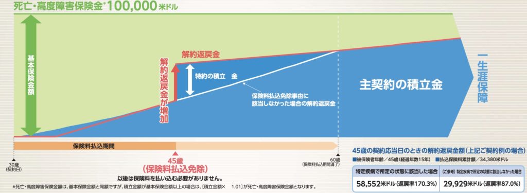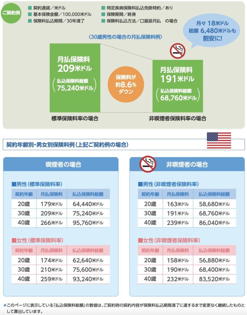 ちなみに三大疾病保険料免除特約はありませんが、同じ条件(死亡保障USD 100,000で払込期間30年)でジブラルタ生命の「米国ドル建終身保険(低解約返戻金型)」だと毎月の保険料はUSD 148なので、総支払保険料はUSD 53,280になります。ジブラルタと比較すると非喫煙者割引があっても約1.3倍も保険料が高くなります。