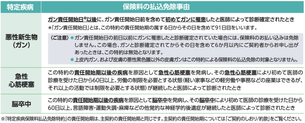 保険料払込期間中に特定疾病で所定の状態に該当した場合、以後の保険料のお払い込みが免除されます。