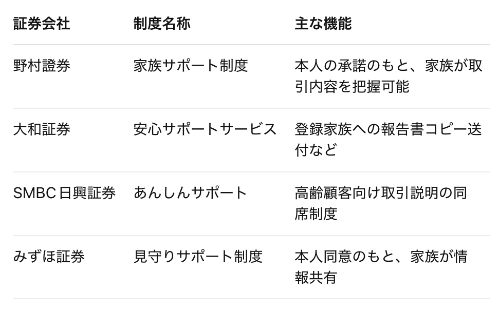 これを回避し、本人の判断能力があるうちに家族との情報共有や意思確認体制を整えておくことが重要となり、証券会社は自主的に家族支援制度を導入する流れが強まっています。