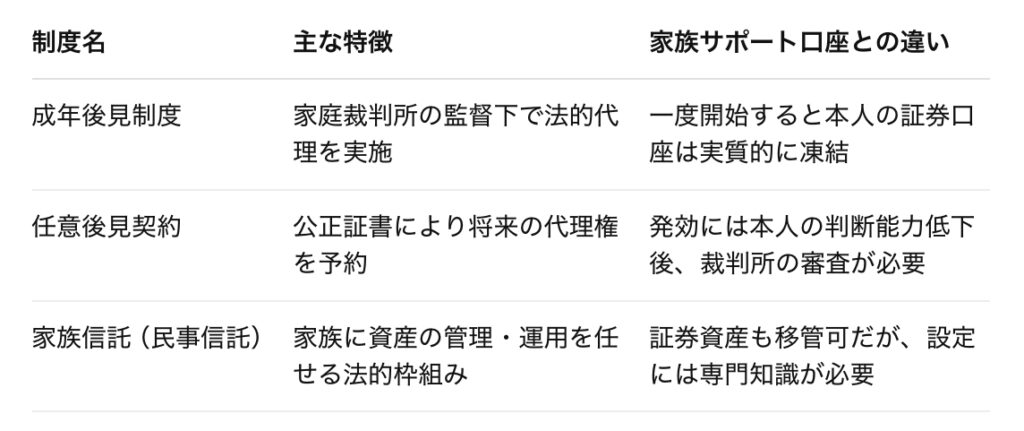 「家族サポート口座」はあくまで金融機関内の運用ルールによる支援制度です。したがって、以下の制度とは目的や法的効力が異なります。