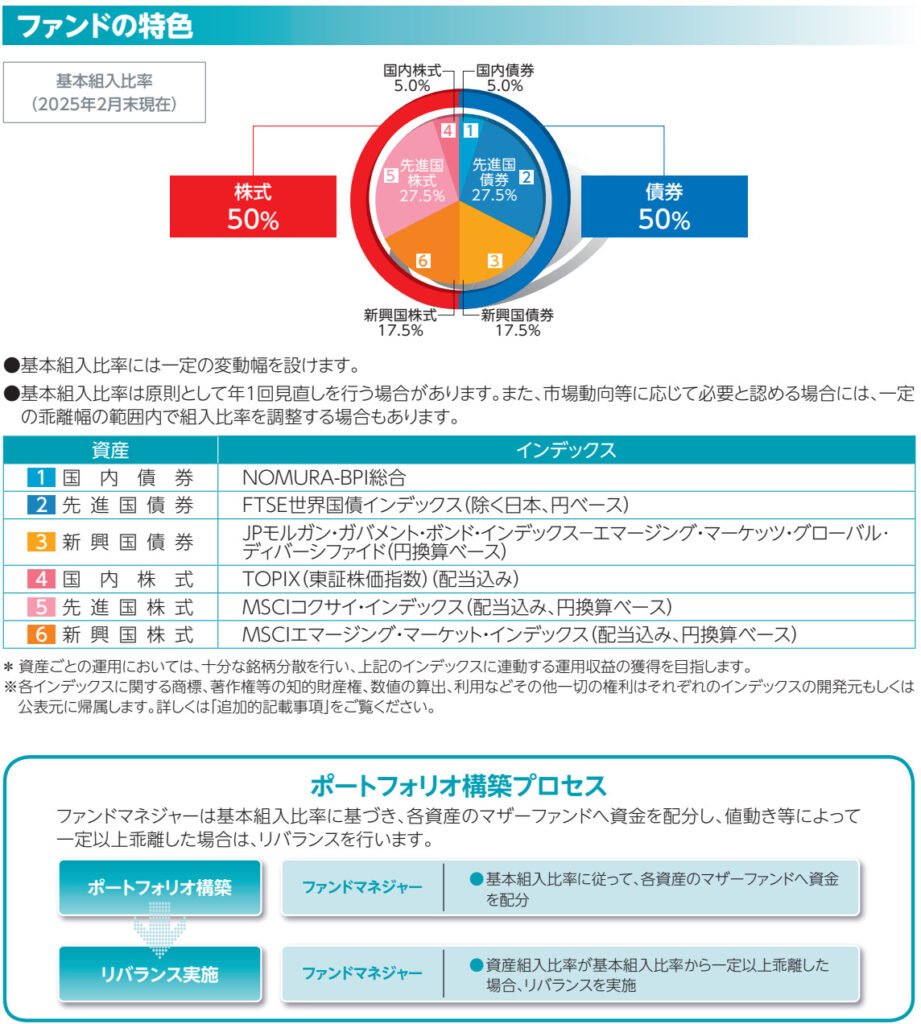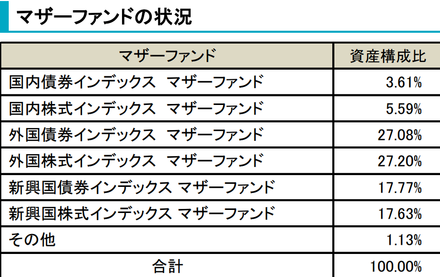 世界のインデックスファンドに分散投資している関係上、投資先はインデックスファンドの構成比率で表記されています。先ほどの解説でも触れましたが、株式と債券が約50%ずつ、その中でさらに先進国、新興国、国内と細分化され分散投資されています。