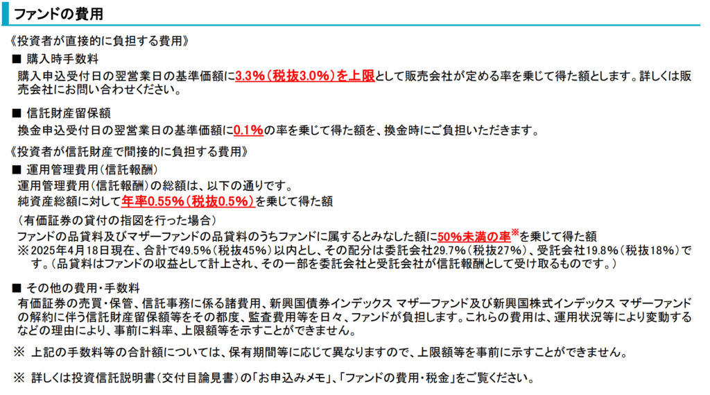 購入手数料は3.3%、解約時手数料は0.1%、毎年の管理費用は年0.55%程度、その他手数料もかかります。
