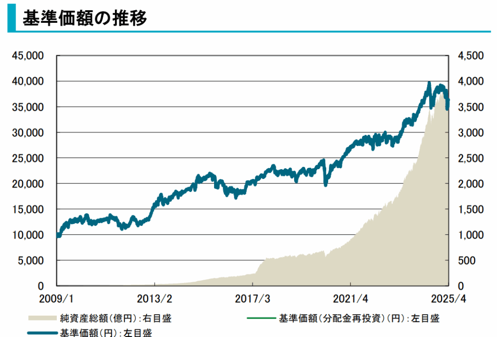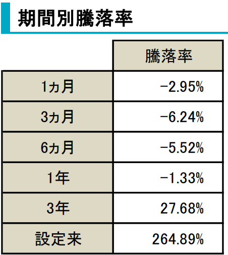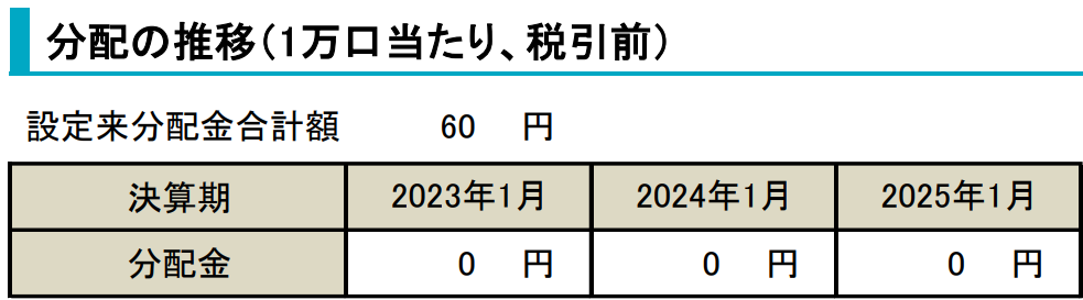 直近1年で-1.33%、3年で+27.68%の騰落率になります。2009年から運用しているファンドですが、分配実績はほとんど0のようです。