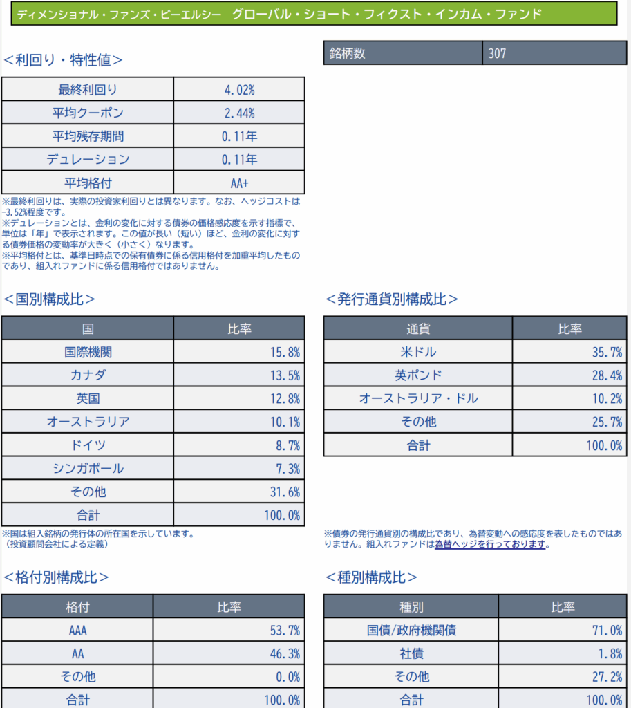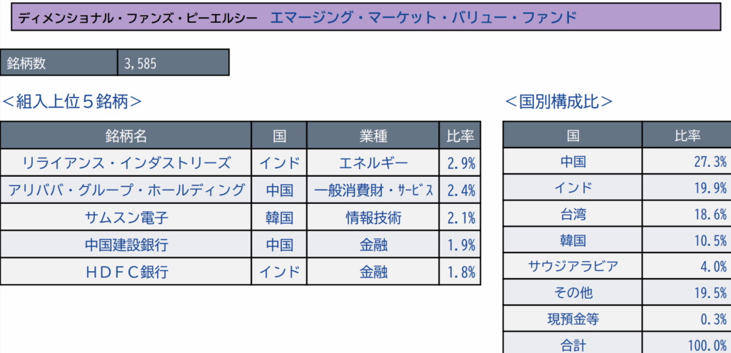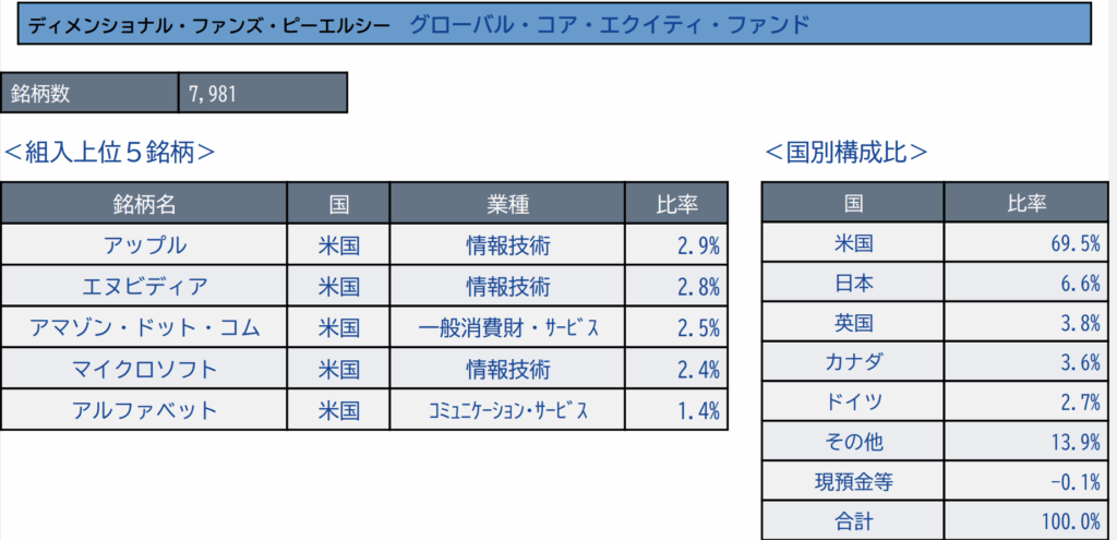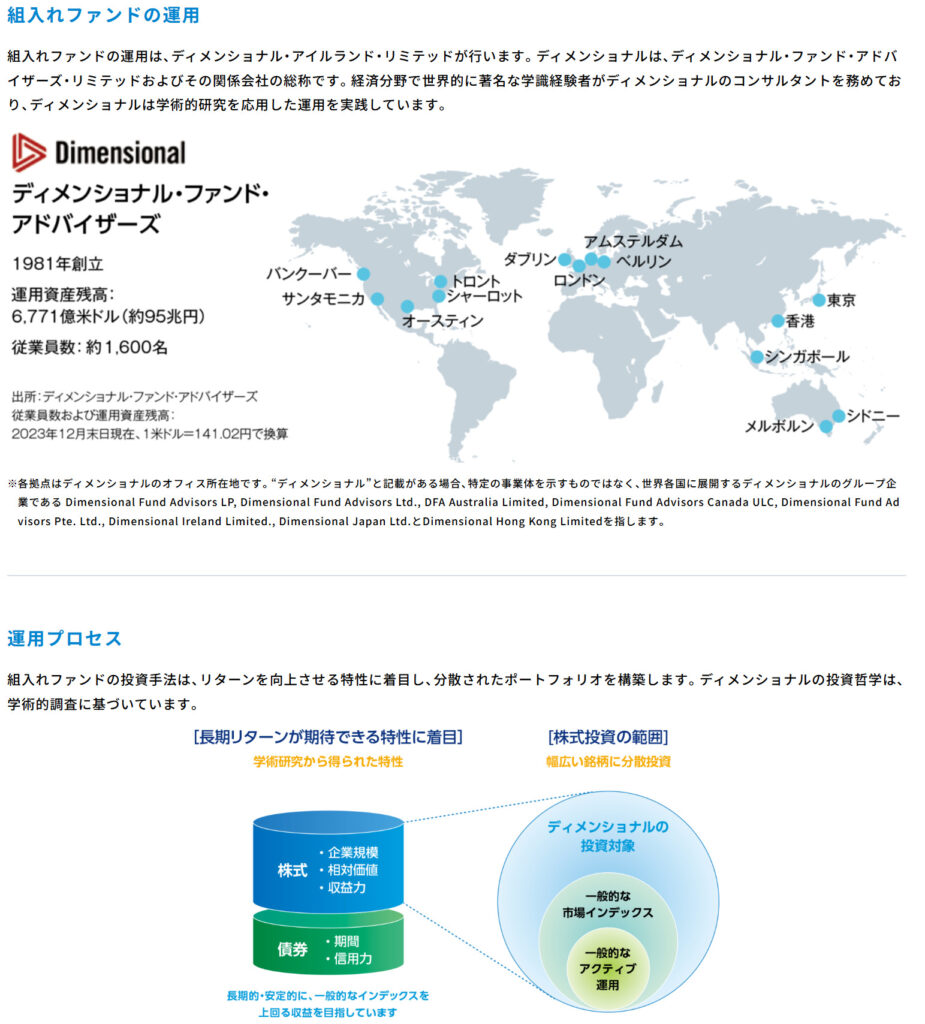 運用しているディメンショナルの3本のファンドに分散投資されています。先ほど触れた段階的な株式購入で先進国株50%、新興国株10%、先進国債券40%の比率になっています。1本のファンドに含まれる銘柄数がかなり多いので、このあたりもリスク管理として考えられているようです。