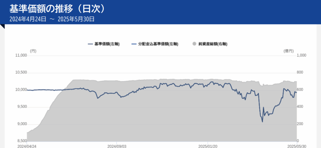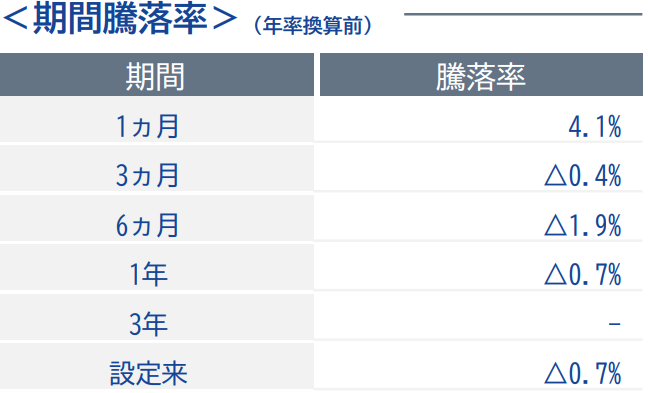 最大5年での満期、償還がある為、こちらのファンドは定期的に販売されています。販売時期によりファンド名に年月がついており、今回はぜんぞう2404の数値で解説します。直近1年で-0.7%、設定来で-0.7%の騰落率になります。