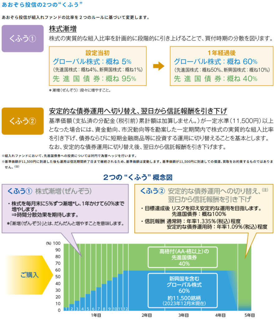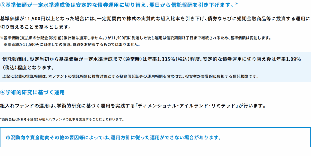 学術的研究に基づく運用を実践する「ディメンショナル・アイルランド・リミテッド」が組入れファンドの運用を行う為、運用手法が通常のファンドとは違います。ファンドを購入すると当初は債券95%で運用が開始され、少しずつ株式を買い増し、1年後には株式が60%の状態になるよう段階的に株式組み入れを増やしていきます。基準価額は10000円から開始されますが、目標基準価額の11500円に到達すると、その後は株式の組み入れ比率を下げ、また最初の債券中心の運用に移行します。5年が満期になり満期償還、もしくは目標達成が早かった場合は繰上償還となります。