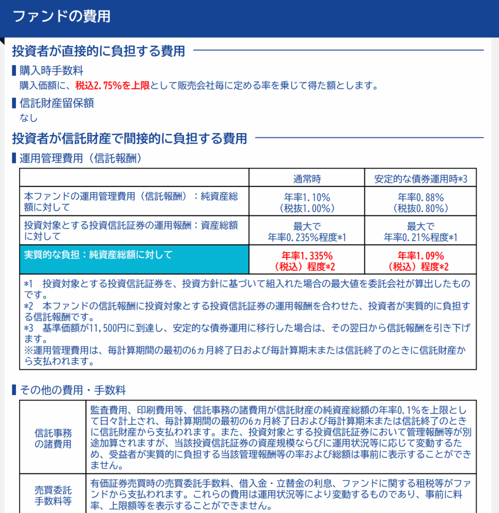 購入手数料は2.75%、毎年の管理費用は年1.335%程度、目標基準価額達成後の債券運用移行後は年1.09%程度、その他手数料もかかります。