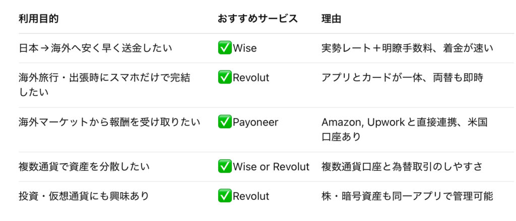 送金や通貨管理は、Wise・Revolut・Payoneerをどれを使うのが良いですか?