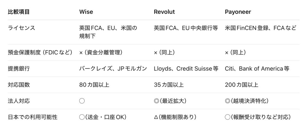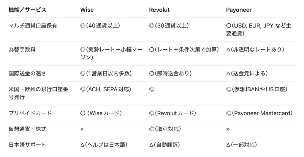 • ① Wise・Revolut・Payoneerの基本情報比較