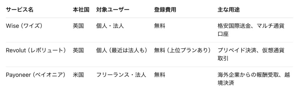 これらは、多通貨の口座保持・低コストの為替・迅速な国際送金を武器に、個人事業主、留学生、フリーランス、海外勤務者、越境EC事業者などに支持されています。