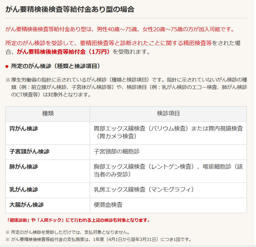 契約年齢(被保険者):がん要精検後検査等給付金あり型 男性40~75歳、女性20~75歳、がん要精検後検査等給付金なし型 3~75歳