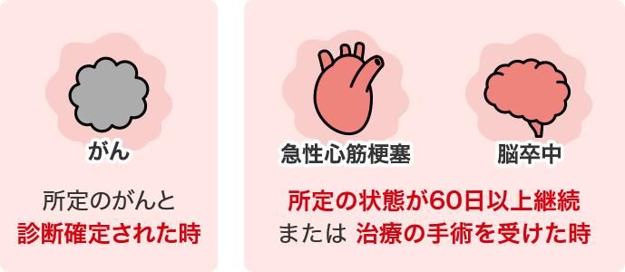 支払事由に該当しない場合でも、所定の急性心筋梗塞・脳卒中と診断確定されたとき、特定疾病診断保険金(3大疾病保険金の金額の10%)を一時金で受取れます。